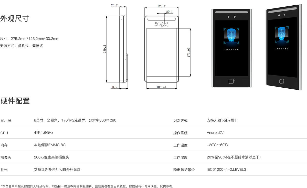300ms即可完成人脸识别,识别准确率高于99%,支持0.5m~1.5m识别通行。